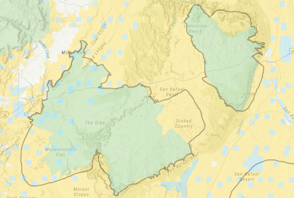 These adjacent horse and burro areas appear to have once been more connected. Today, they are divided by land managed for other uses, further restricting movement and habitat connectivity for the Muddy Creek (wild horse) and Sinbad (wild burro) herds.