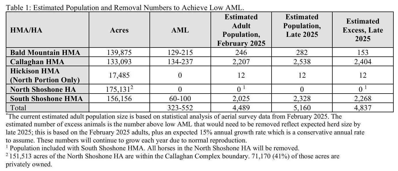 However, that number is divided among multiple Herd Management Areas (HMAs) within the Complex — including Callaghan, South Shoshone, Bald Mountain, and Hickison (north portion), with North Shoshone designated at AML zero.