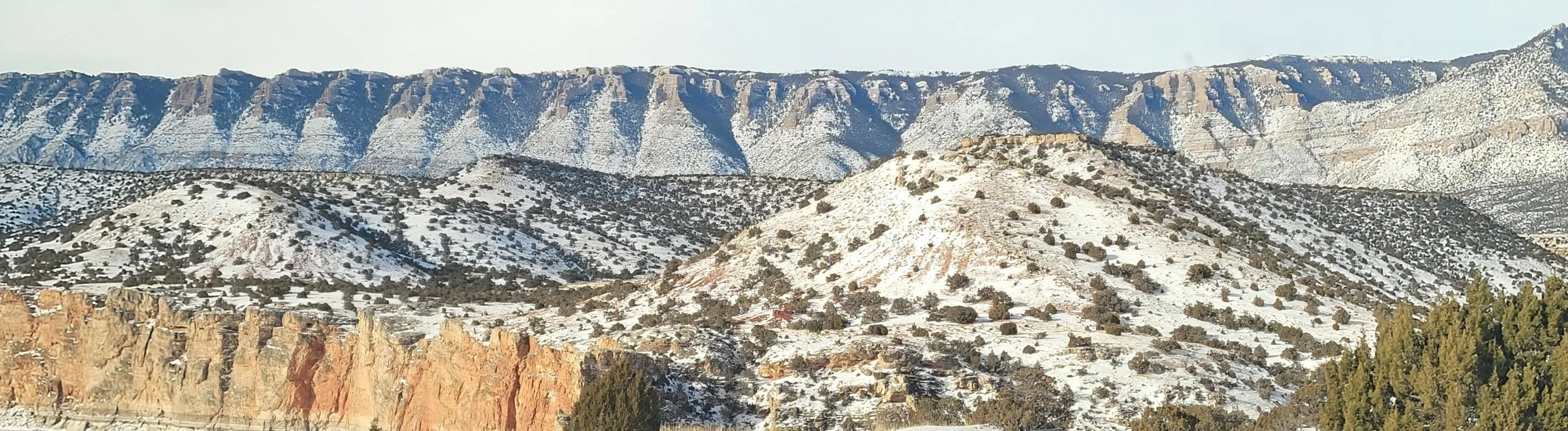 We wanted to make our way up where we could see Turkey Flats—a favorite spot for winter foraging for bands like MatoSka's! But before heading toward the red buttes of Lower Sykes Road, we drove out along a power line service road. No horses out there... But we did find some deer! 👇