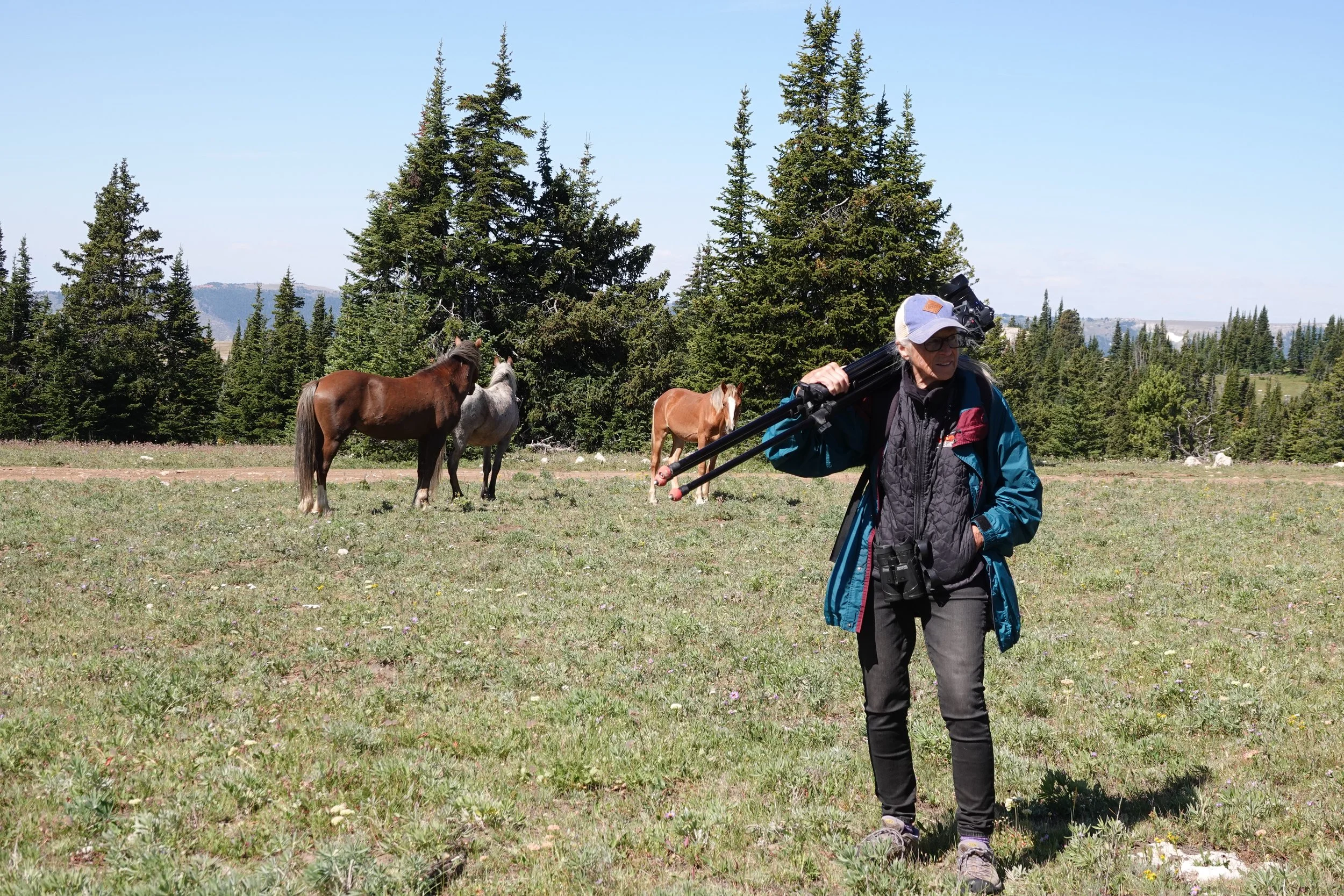 Things seemed to be falling into place for little Zane Grey, so we headed up toward the big pond. On the way, we discovered a band of horses making their way through the trees led by a pretty buckskin mare. It was Jewel! Nickel’s band! We watched them for a few moments, then made our way to the pond in hopes of getting ahead of them. 👇
