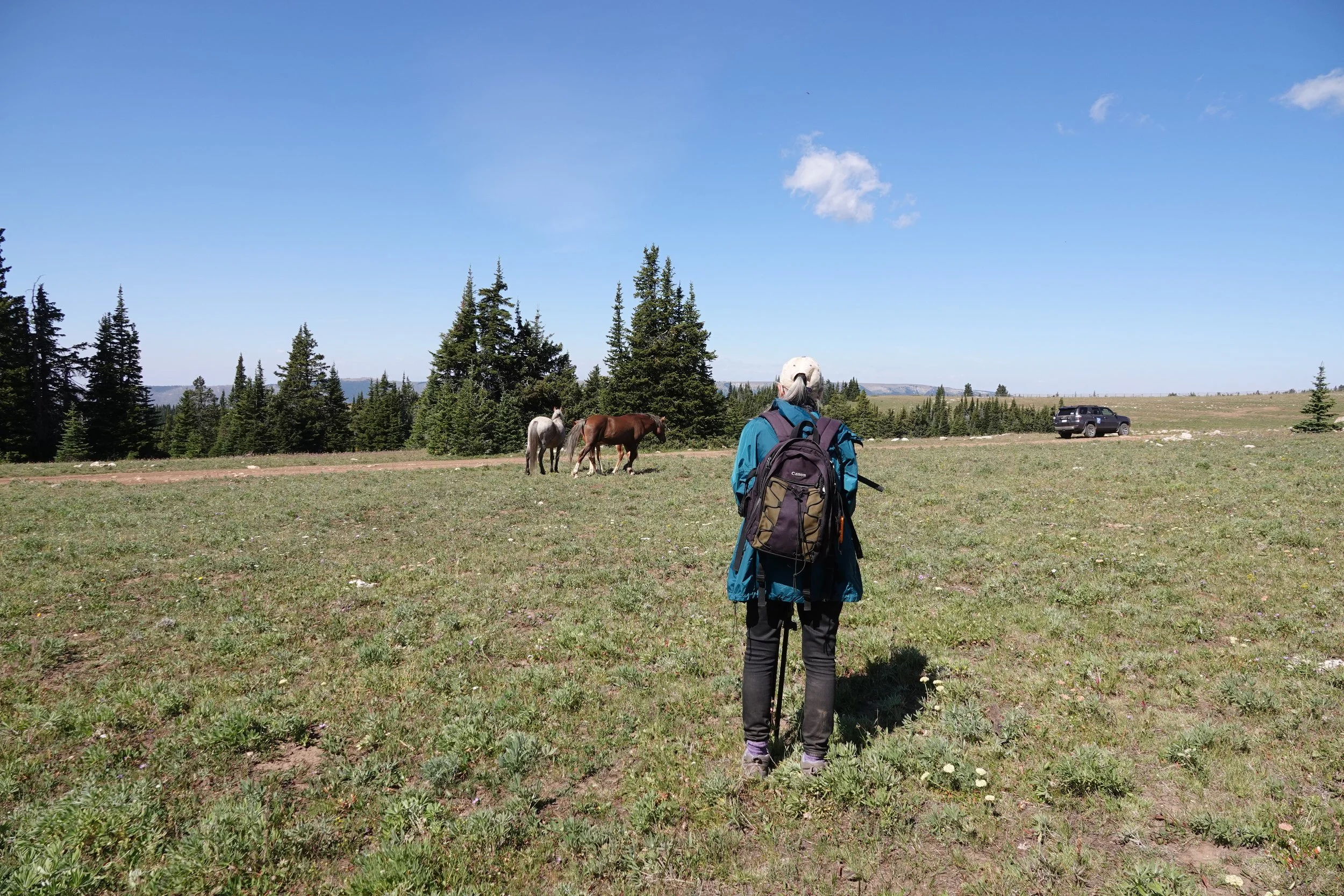 While on the mountain, we found our good friend Dennis and joined forces in our search for horses - particularly, the now elusive Encore and family! We set out on a hike to the Skyline (the very top of the mountain range) on a search to find them. The Skyline meadows often see bands of horses enjoying the rich summer grasses, but as always in the Pryors, nothing is guaranteed. On this day, the ridges were quiet — no Encore. No horses at all.