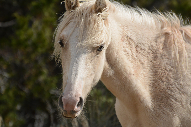 As I hike, I see a flash of movement in a stand of junipers and stare through my binoculars. There it is again. It looks like the flick of a tail behind the dense trees—a stubby, black tail. Could it be Ohanzee? I hike closer and the handsome blaze-faced foal comes into view with his mother, Feldspar. Farther away I can see the small dun mare, Innocentes. Then I spot Cloud foraging in the grassy canyon. But where's the foal?