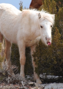 On closer examination, Medicine Bow looked fine. The beautiful and unusual sabino was orphaned when he was only about 7 months old or so. He spent his first winter in and around Cougar Canyon with the new band stallion, Cloud, Cloud’s first mare, Queen, and her son Red Cloud. Medicine Bow still bares the facial scars from a mountain lion attack when he was 2 years old. Never count a Pryor mustang out, I thought.