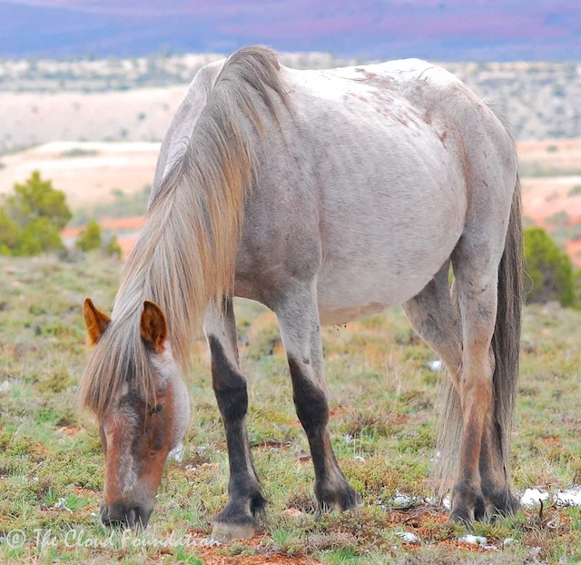 We drive back down from the mines and I spot a blaze-faced blue roan on the side slope of a canyon. There is only one horse in the Pryors that this can be—Mato Ska! Cloud’s two-year old son is grazing on the abundance of new grass. I can’t remember a year when there was this much forage, a by-product of all the snow and rain. Mato Ska means “silver bear” in the Lakota language, and the colt is just that. His body is a silvery white and he looks well, but small out here all alone. When Cloud was his age he was kicked out of the family by his father, Raven.